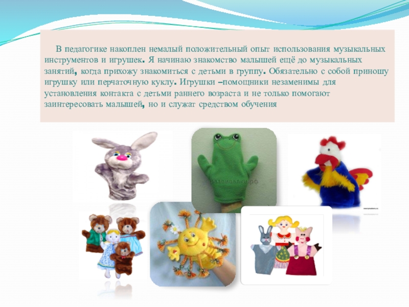 Я начинаю знакомство малышей ещё до музыкальных занятий, когда прихожу знакомиться с детьми в группу. Обязательно с собой приношу игрушку или перчаточную куклу. Игрушки –помощники незаменимы для установления контакта с детьми раннего возраста и не только помогают заинтересовать малышей, но и служат средством обучения