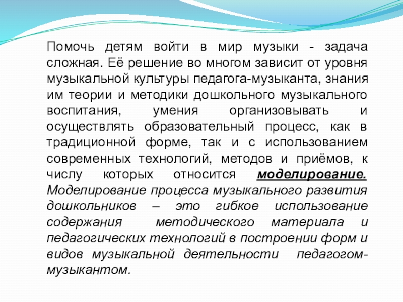 во многом зависит от уровня музыкальной культуры педагога-музыканта, знания им теории и методики дошкольного музыкального воспитания, умения организовывать и осуществлять образовательный процесс, как в традиционной форме, так и с использованием современных технологий, методов и приёмов, к числу которых относится моделирование. Моделирование процесса музыкального развития дошкольников – это гибкое использование содержания методического материала и педагогических технологий в построении форм и видов музыкальной деятельности педагогом-музыкантом.