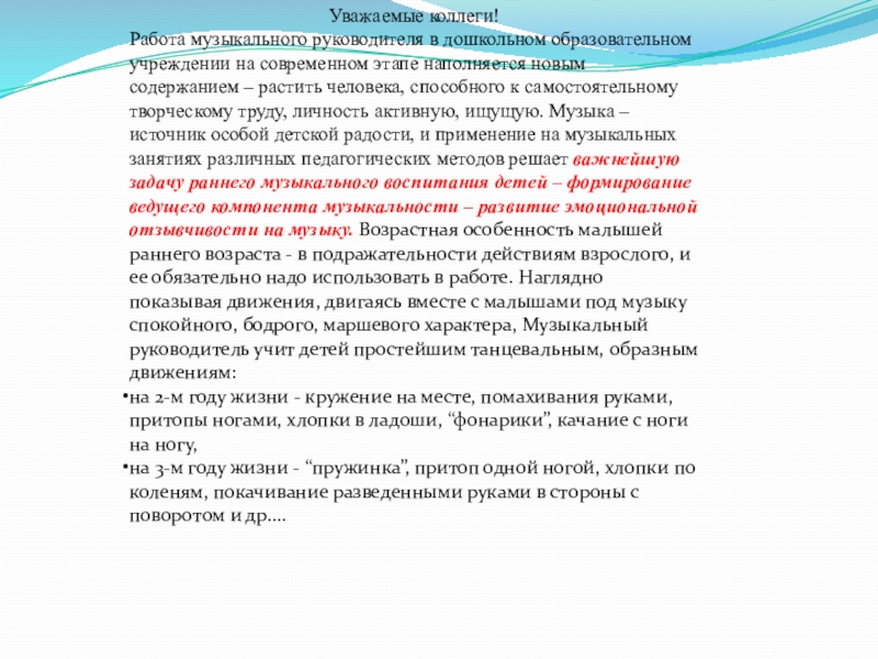 наполняется новым содержанием – растить человека, способного к самостоятельному творческому труду, личность активную, ищущую. Музыка – источник особой детской радости, и применение на музыкальных занятиях различных педагогических методов решает важнейшую задачу раннего музыкального воспитания детей – формирование ведущего компонента музыкальности – развитие эмоциональной отзывчивости на музыку. Возрастная особенность малышей раннего возраста - в подражательности действиям взрослого, и ее обязательно надо использовать в работе. Наглядно показывая движения, двигаясь вместе с малышами под музыку спокойного, бодрого, маршевого характера, Музыкальный руководитель учит детей простейшим танцевальным, образным движениям: