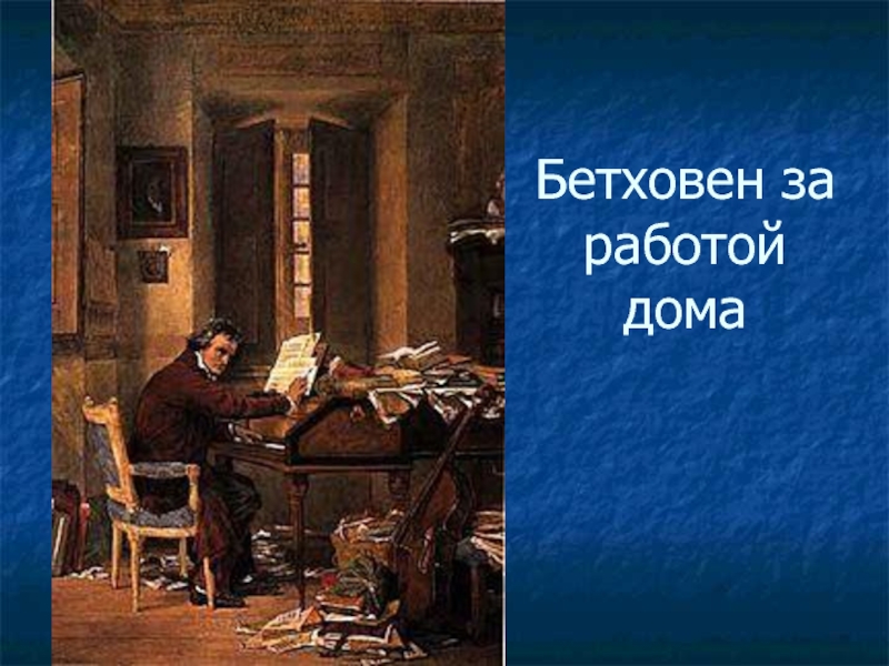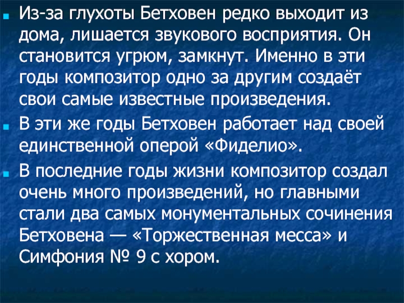 Слайд 17Из-за глухоты Бетховен редко выходит из дома, лишается звукового восприятия. Он