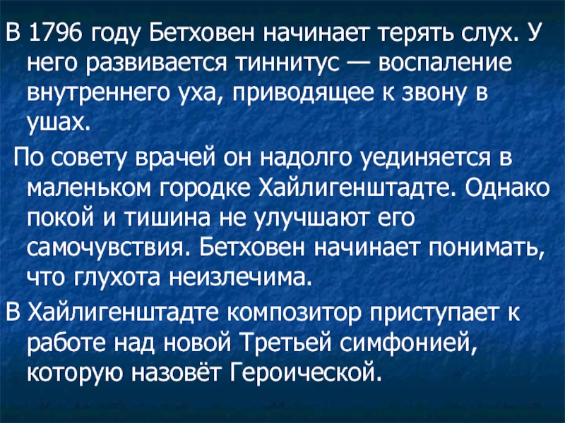 По совету врачей он надолго уединяется в маленьком городке Хайлигенштадте. Однако покой и тишина не улучшают его самочувствия. Бетховен начинает понимать, что глухота неизлечима.