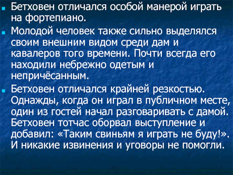 Бетховен отличался крайней резкостью. Однажды, когда он играл в публичном месте, один из гостей начал разговаривать с дамой. Бетховен тотчас оборвал выступление и добавил: «Таким свиньям я играть не буду!». И никакие извинения и уговоры не помогли.