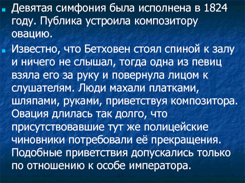 Слайд 18Девятая симфония была исполнена в 1824 году. Публика устроила композитору овацию.