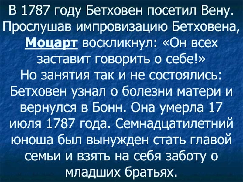 Но занятия так и не состоялись: Бетховен узнал о болезни матери и вернулся в Бонн. Она умерла 17 июля 1787 года. Семнадцатилетний юноша был вынужден стать главой семьи и взять на себя заботу о младших братьях.