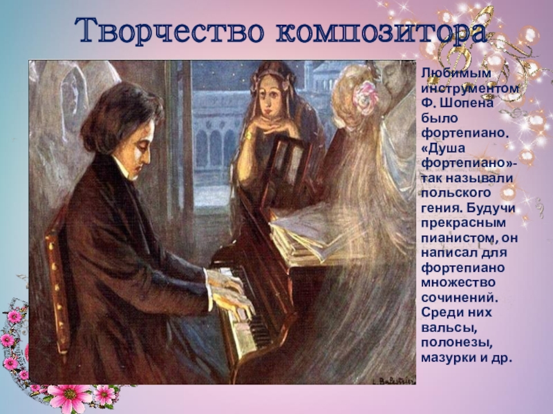 называли польского гения. Будучи прекрасным пианистом, он написал для фортепиано множество сочинений. Среди них вальсы, полонезы, мазурки и др.