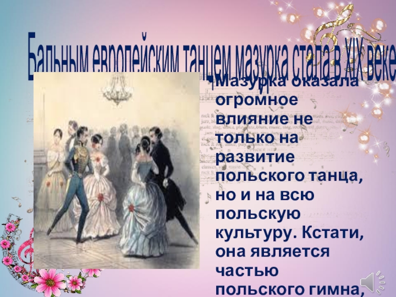 не только на развитие польского танца, но и на всю польскую культуру. Кстати, она является частью польского гимна, созданного в 1797 году.