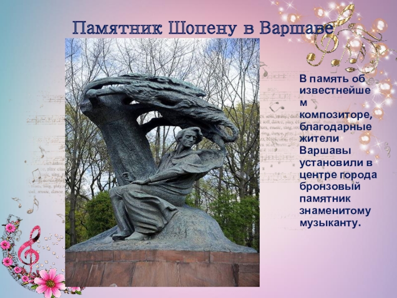 Слайд 13В память об известнейшем композиторе, благодарные жители Варшавы установили в центре