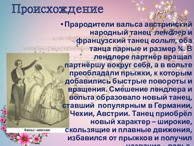 Прародители вальса австрийский народный танец лендлер и французский танец вольт, оба