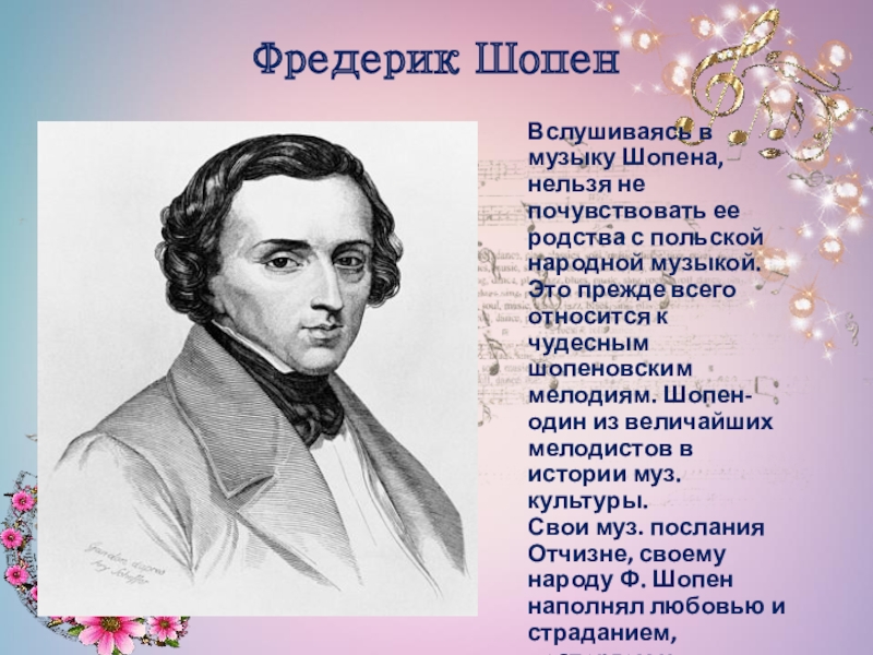 народной музыкой. Это прежде всего относится к чудесным шопеновским мелодиям. Шопен-один из величайших мелодистов в истории муз. культуры. Свои муз. послания Отчизне, своему народу Ф. Шопен наполнял любовью и страданием, восторгом и отчаянием.