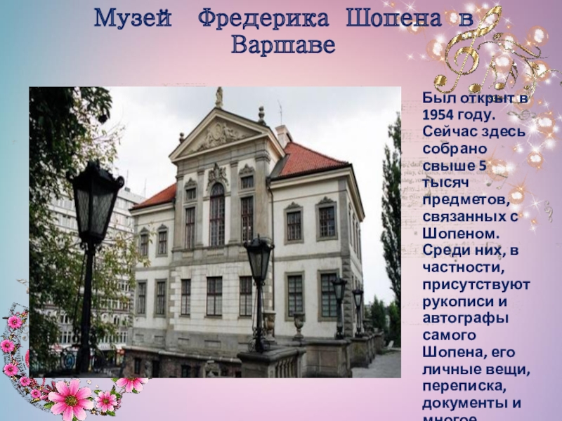 предметов, связанных с Шопеном. Среди них, в частности, присутствуют рукописи и автографы самого Шопена, его личные вещи, переписка, документы и многое другое.