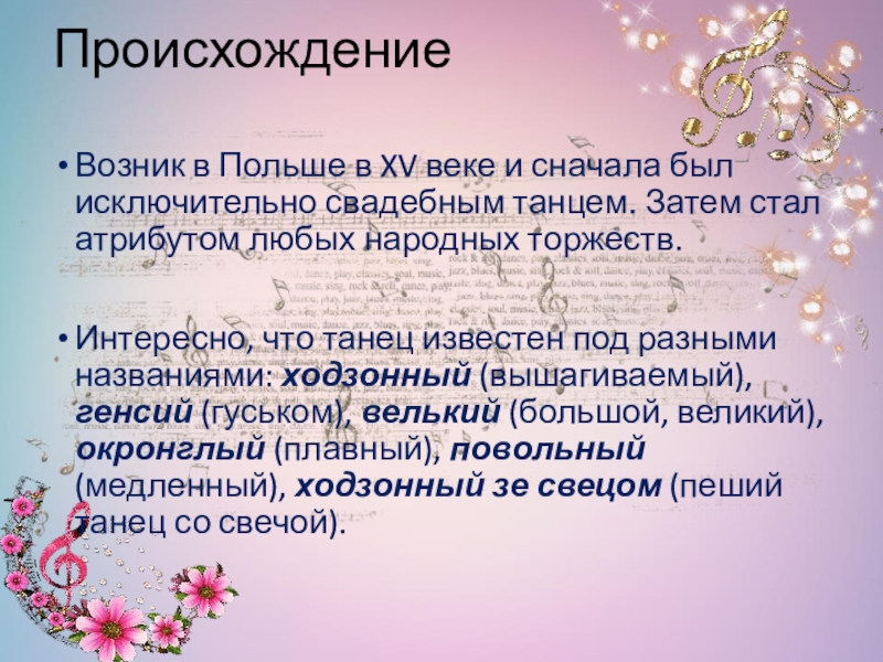 Торжественный танец-шествие в умеренном темпе, имеющий польское происхождение. Исполнялся в начале