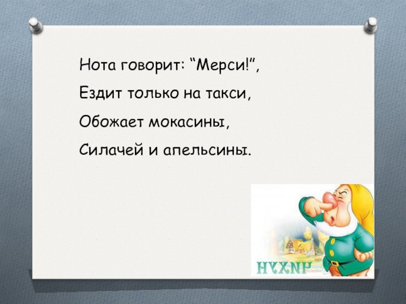 Нота говорит: “Мерси!”,Ездит только на такси,Обожает мокасины,Силачей и апельсины.