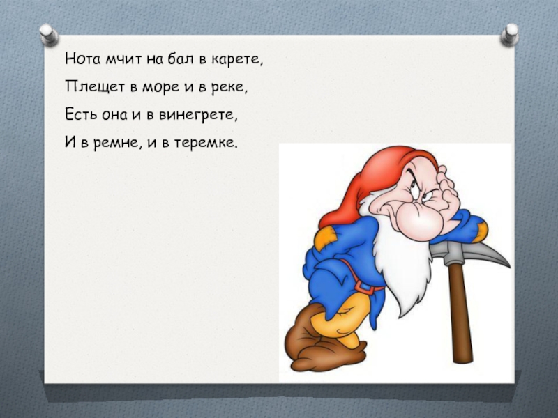 Нота мчит на бал в карете,Плещет в море и в реке,Есть она и в винегрете,И в ремне,