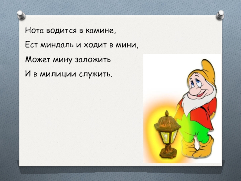 Нота водится в камине,Ест миндаль и ходит в мини,Может мину заложитьИ в милиции служить.