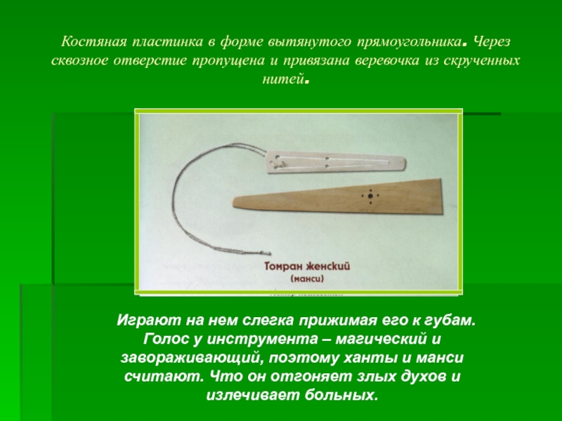 Играют на нем слегка прижимая его к губам. Голос у инструмента – магический и завораживающий, поэтому ханты и манси считают. Что он отгоняет злых духов и излечивает больных.