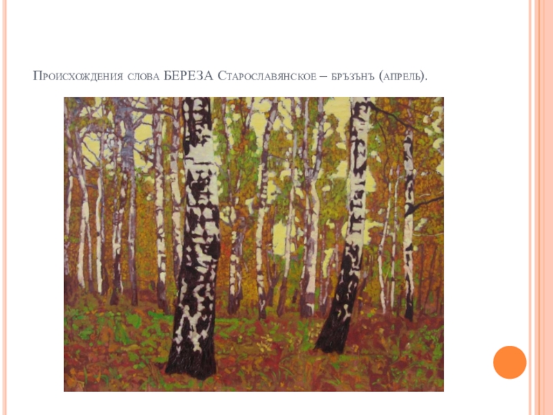 Слайд 2Происхождения слова БЕРЕЗА Старославянское – бръзънъ (апрель).