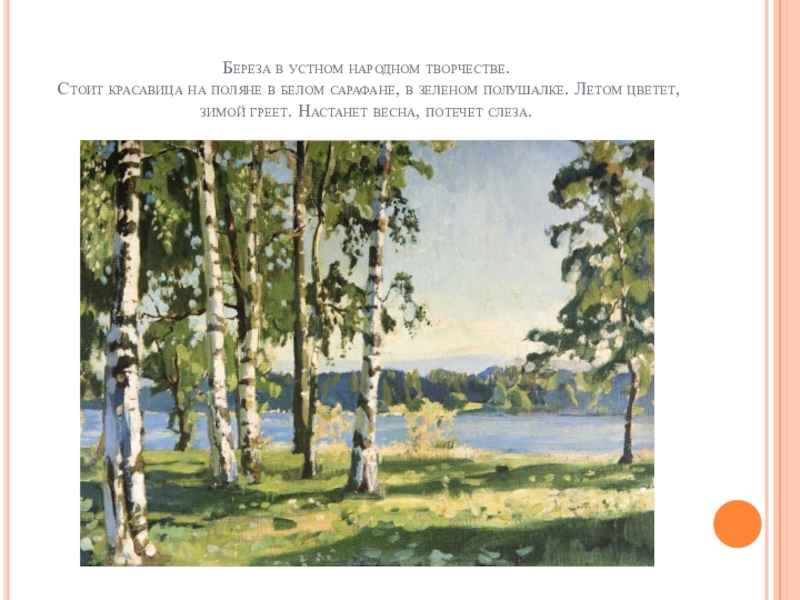 Береза в устном народном творчестве.  Стоит красавица на поляне в белом сарафане, в зеленом полушалке. Летом