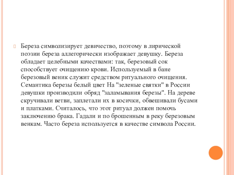 Береза символизирует девичество, поэтому в лирической поэзии береза аллегорически изображает девушку. Береза обладает целебными качествами: так, березовый