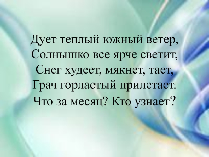 Дует теплый южный ветер, Солнышко все ярче светит, Снег худеет, мякнет, тает, Грач горластый прилетает. Что за