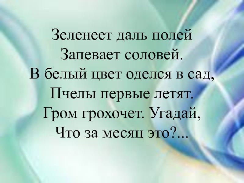 Зеленеет даль полей Запевает соловей. В белый цвет оделся в сад, Пчелы первые летят. Гром грохочет. Угадай,
