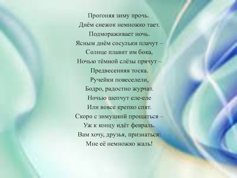 сосульки плачут – Солнце плавит им бока, Ночью тёмной слёзы прячут – Предвесенняя тоска.  Ручейки повеселели, Бодро, радостно журчат. Ночью шепчут еле-еле Или вовсе крепко спят.  Скоро с зимушкой прощаться – Уж к концу идёт февраль. Вам хочу, друзья, признаться: Мне её немножко жаль!