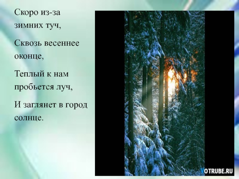 Скоро из-за зимних туч, Сквозь весеннее оконце, Теплый к нам пробьется луч, И заглянет в город солнце.