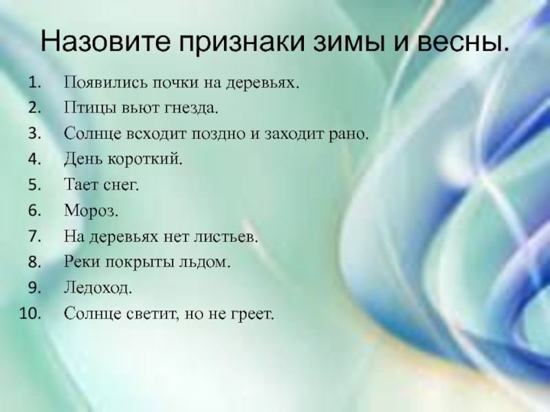 Назовите признаки зимы и весны.Появились почки на деревьях.Птицы вьют гнезда.Солнце всходит поздно и заходит рано.День короткий.Тает снег.Мороз.На