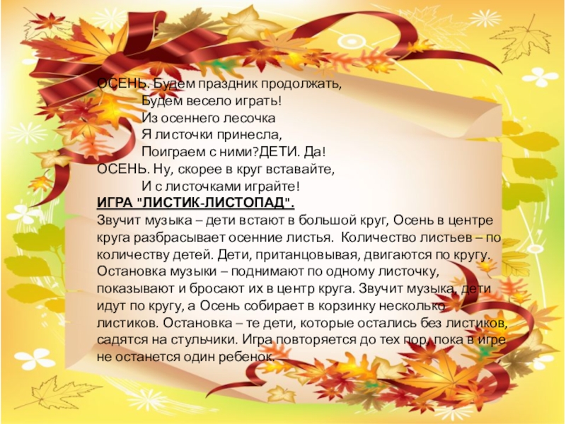 Звучит музыка – дети встают в большой круг, Осень в центре круга разбрасывает осенние листья. Количество листьев – по количеству детей. Дети, пританцовывая, двигаются по кругу. Остановка музыки – поднимают по одному листочку, показывают и бросают их в центр круга. Звучит музыка, дети идут по кругу, а Осень собирает в корзинку несколько листиков. Остановка – те дети, которые остались без листиков, садятся на стульчики. Игра повторяется до тех пор, пока в игре не останется один ребенок.