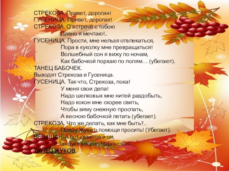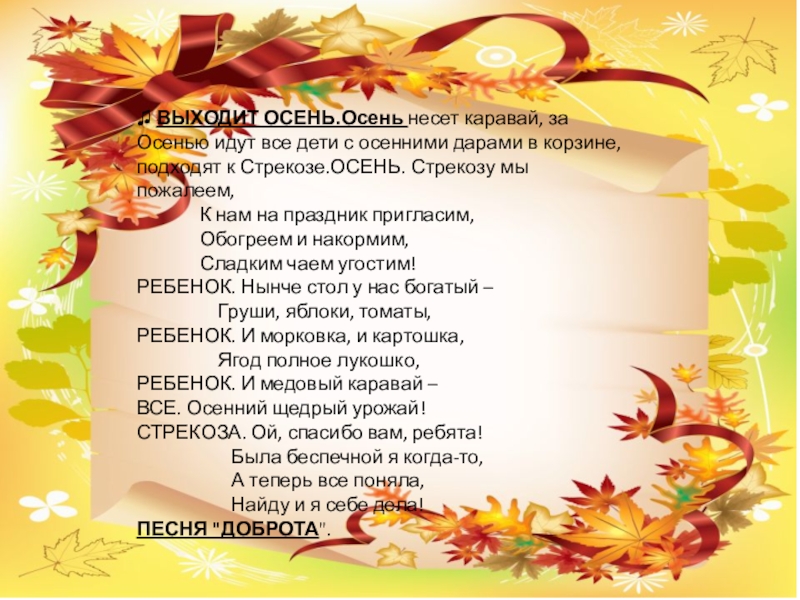 осенними дарами в корзине, подходят к Стрекозе.ОСЕНЬ. Стрекозу мы пожалеем,