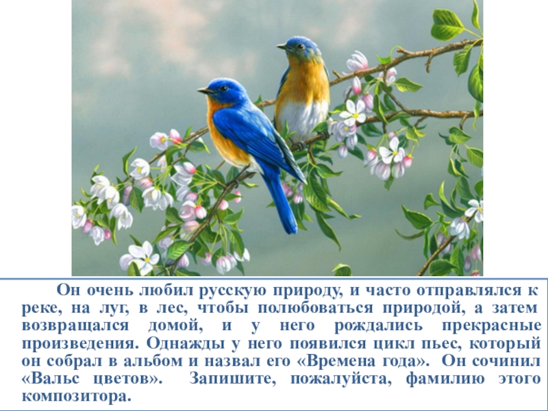 часто отправлялся к реке, на луг, в лес, чтобы полюбоваться природой, а затем возвращался домой, и у него рождались прекрасные произведения. Однажды у него появился цикл пьес, который он собрал в альбом и назвал его «Времена года». Он сочинил «Вальс цветов». Запишите, пожалуйста, фамилию этого композитора.