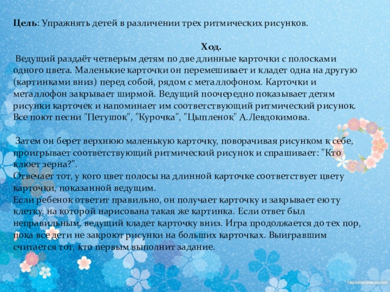 Ведущий раздаёт четверым детям по две длинные карточки с полосками одного цвета. Маленькие карточки он перемешивает и кладет одна на другую (картинками вниз) перед собой, рядом с металлофоном. Карточки и металлофон закрывает ширмой. Ведущий поочередно показывает детям рисунки карточек и напоминает им соответствующий ритмический рисунок. Все поют песни "Петушок", "Курочка", "Цыпленок" А.Левдокимова.