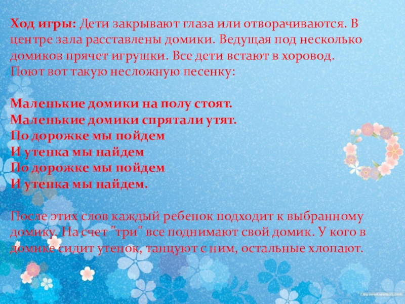 После этих слов каждый ребенок подходит к выбранному домику. На счет "три" все поднимают свой домик. У кого в домике сидит утенок, танцуют с ним, остальные хлопают.
