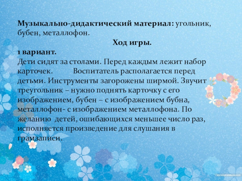 Слайд 5Музыкально-дидактический материал: угольник, бубен, металлофон.