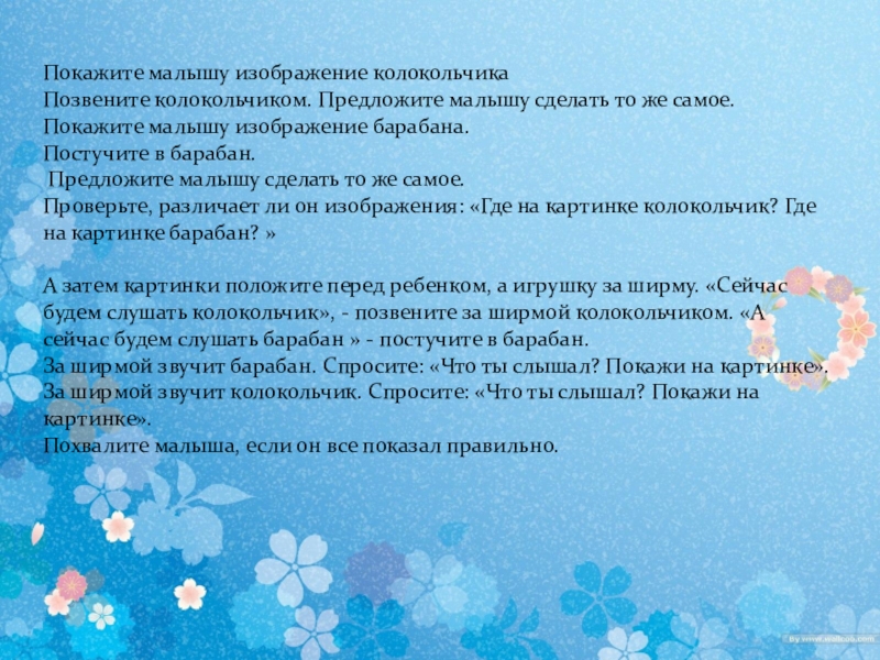 А затем картинки положите перед ребенком, а игрушку за ширму. «Сейчас будем слушать колокольчик», - позвените за ширмой колокольчиком. «А сейчас будем слушать барабан » - постучите в барабан.