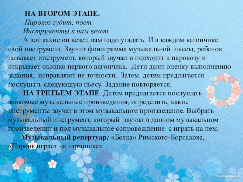 А вот какие он везет, вам надо угадать. И в каждом вагончике свой инструмент. Звучит фонограмма музыкальной пьесы, ребенок называет инструмент, который звучал и подходит к паровозу и открывает окошко первого вагончика. Дети дают оценку выполнению задания, исправляют не точности. Затем детям предлагается послушать следующую пьесу. Задание повторяется.