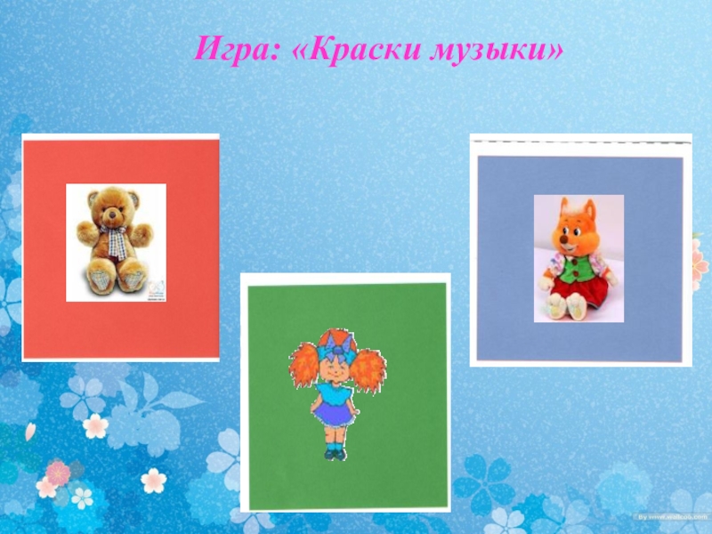 Игровой материал: квадраты разных цветов: красный, зеленый, голубой, любая игрушка, раздаточные карточки по количеству детей трех цветов: красный, зеленый, голубой.