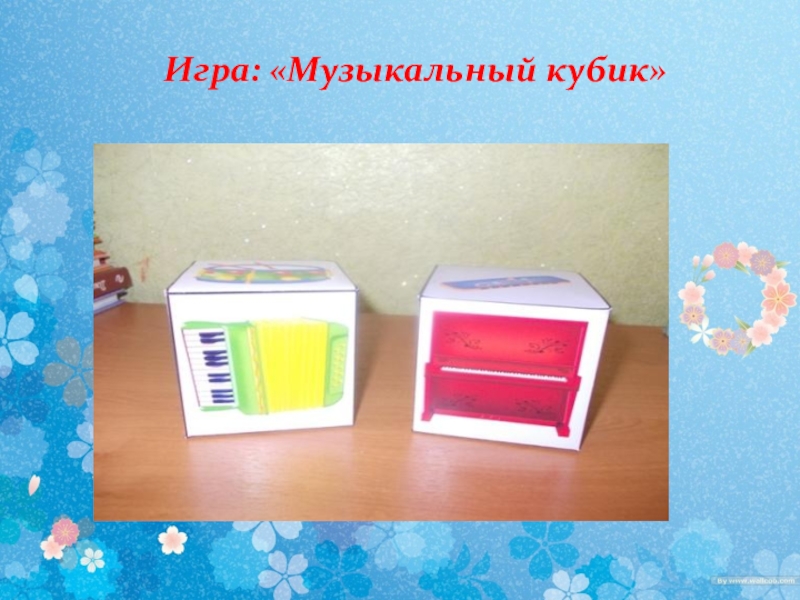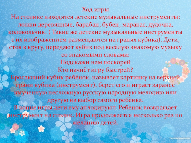 маракас, дудочка, колокольчик. ( Такие же детские музыкальные инструменты с их изображением размещаются на гранях кубика). Дети, стоя в кругу, передают кубик под весёлую знакомую музыку со знакомыми словами: