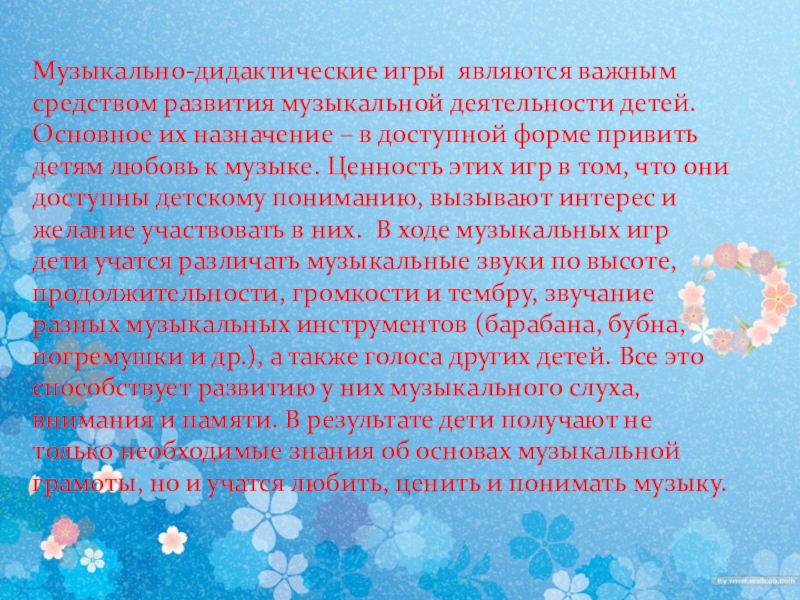 средством развития музыкальной деятельности детей. Основное их назначение – в доступной форме привить детям любовь к музыке. Ценность этих игр в том, что они доступны детскому пониманию, вызывают интерес и желание участвовать в них. В ходе музыкальных игр дети учатся различать музыкальные звуки по высоте, продолжительности, громкости и тембру, звучание разных музыкальных инструментов (барабана, бубна, погремушки и др.), а также голоса других детей. Все это способствует развитию у них музыкального слуха, внимания и памяти. В результате дети получают не только необходимые знания об основах музыкальной грамоты, но и учатся любить, ценить и понимать музыку.