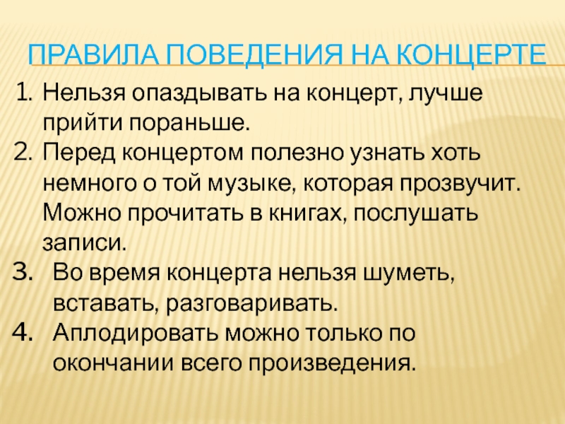 Правила поведения на концертеНельзя опаздывать на концерт, лучше прийти пораньше.Перед концертом полезно узнать хоть немного о той