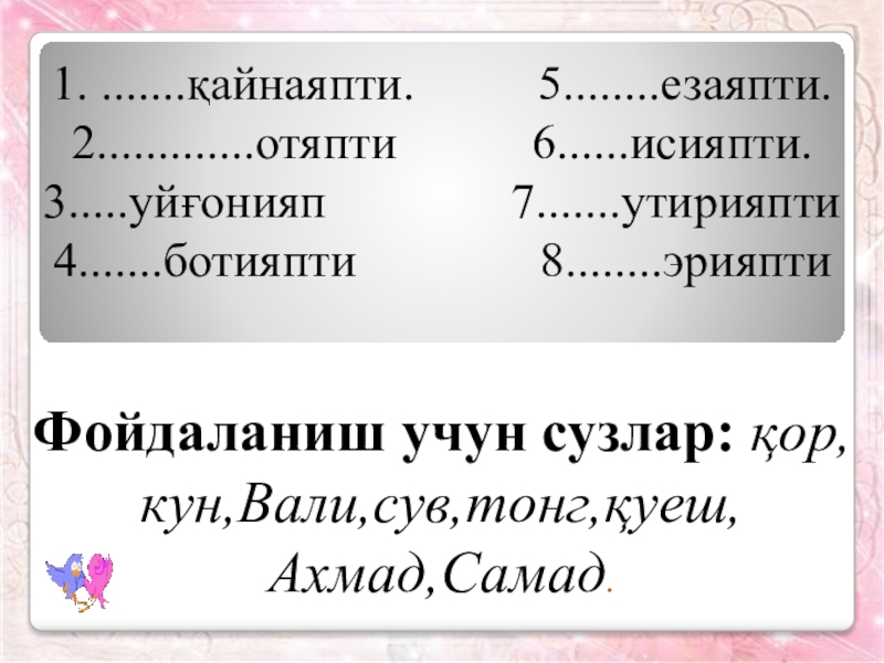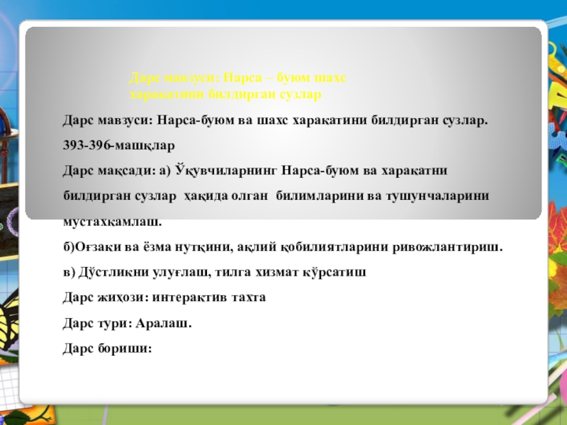 Дарс мавзуси: Нарса – буюм шахс харакатини билдирган сузлар