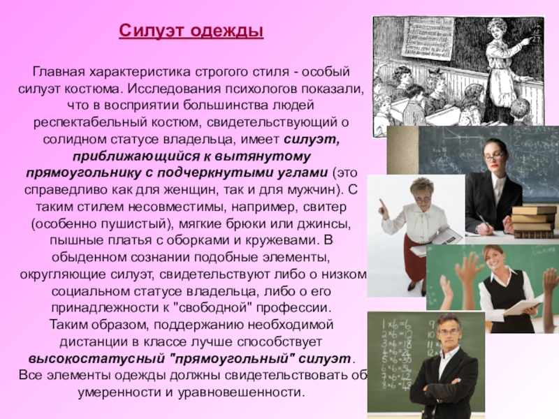 Таким образом, поддержанию необходимой дистанции в классе лучше способствует высокостатусный "прямоугольный" силуэт. Все элементы одежды должны свидетельствовать об умеренности и уравновешенности.