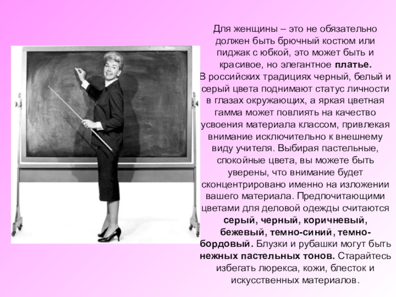 В российских традициях черный, белый и серый цвета поднимают статус личности в глазах окружающих, а яркая цветная гамма может повлиять на качество усвоения материала классом, привлекая внимание исключительно к внешнему виду учителя. Выбирая пастельные, спокойные цвета, вы можете быть уверены, что внимание будет сконцентрировано именно на изложении вашего материала. Предпочитающими цветами для деловой одежды считаются серый, черный, коричневый, бежевый, темно-синий, темно-бордовый. Блузки и рубашки могут быть нежных пастельных тонов. Старайтесь избегать люрекса, кожи, блесток и искусственных материалов.