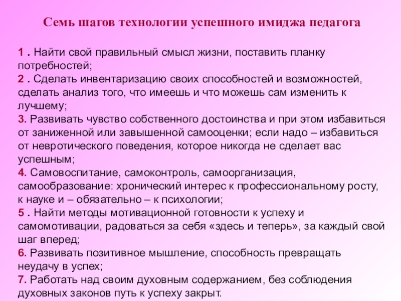 Слайд 14Семь шагов технологии успешного имиджа педагога