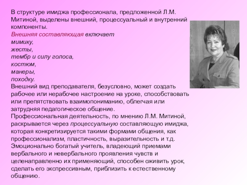 Слайд 6В структуре имиджа профессионала, предложенной Л.М. Митиной, выделены внешний, процессуальный и