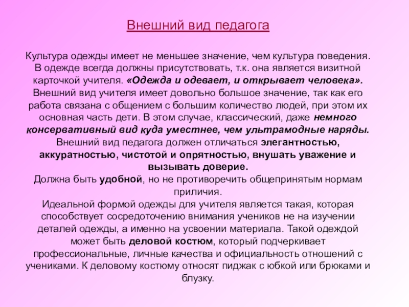 Внешний вид педагога должен отличаться элегантностью, аккуратностью, чистотой и опрятностью, внушать уважение и вызывать доверие.