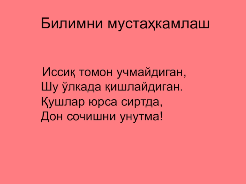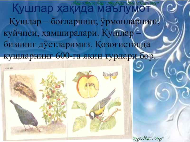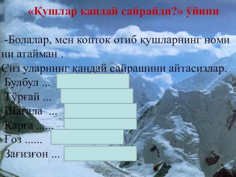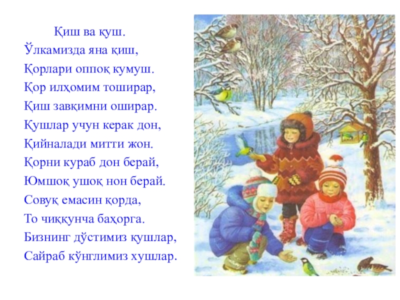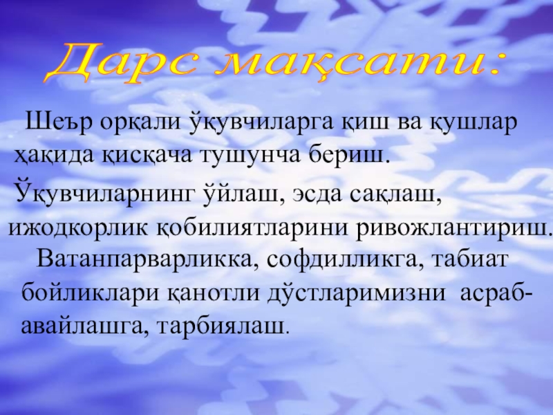 Ватанпарварликка, софдилликга, табиат бойликлари қанотли дўстларимизни асраб-авайлашга, тарбиялаш.