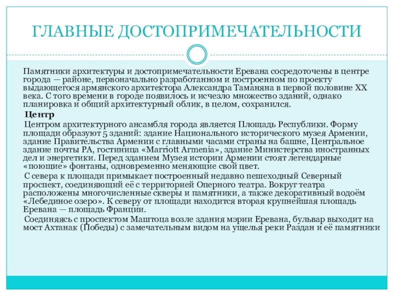 Памятники архитектуры и достопримечательности Еревана сосредоточены в центре