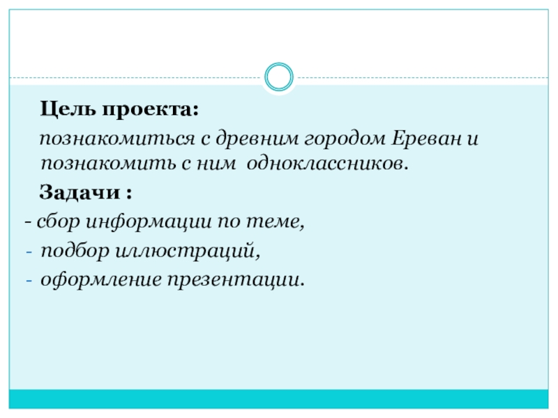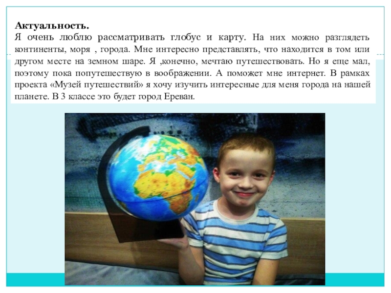 разглядеть континенты, моря , города. Мне интересно представлять, что находится в том или другом месте на земном шаре. Я ,конечно, мечтаю путешествовать. Но я еще мал, поэтому пока попутешествую в воображении. А поможет мне интернет. В рамках проекта «Музей путешествий» я хочу изучить интересные для меня города на нашей планете. В 3 классе это будет город Ереван.