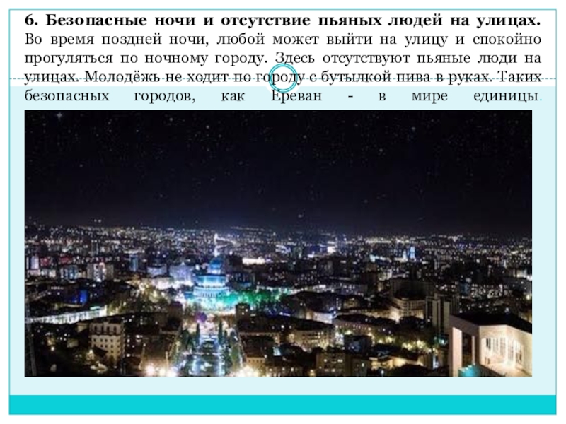 поздней ночи, любой может выйти на улицу и спокойно прогуляться по ночному городу. Здесь отсутствуют пьяные люди на улицах. Молодёжь не ходит по городу с бутылкой пива в руках. Таких безопасных городов, как Ереван - в мире единицы.