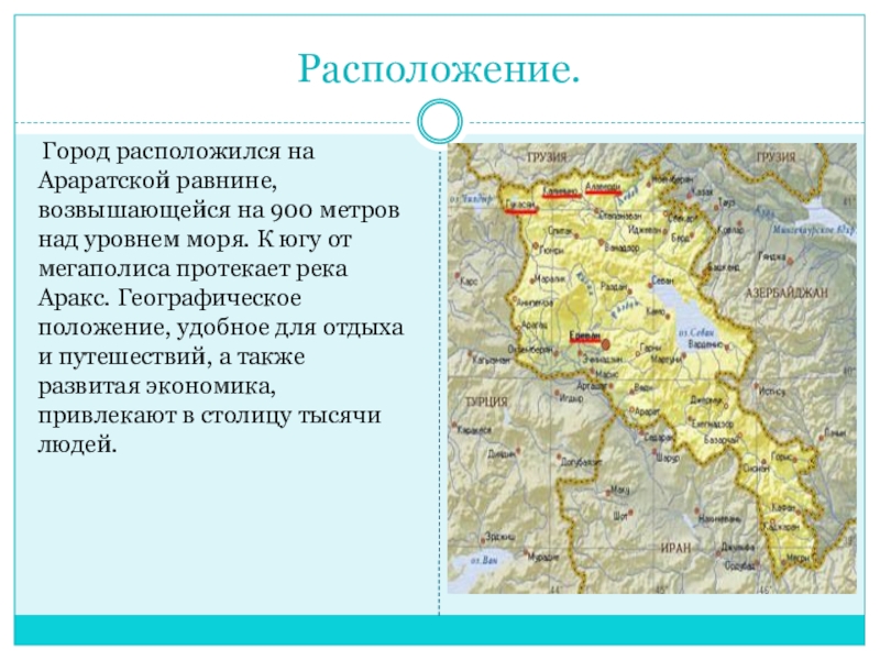 уровнем моря. К югу от мегаполиса протекает река Аракс. Географическое положение, удобное для отдыха и путешествий, а также развитая экономика, привлекают в столицу тысячи людей.